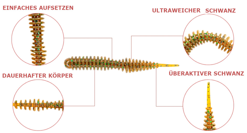 • Sokkal több akció és sokoldalúbb használat a hagyományos lágy férek formájú műcsalikhoz képest.